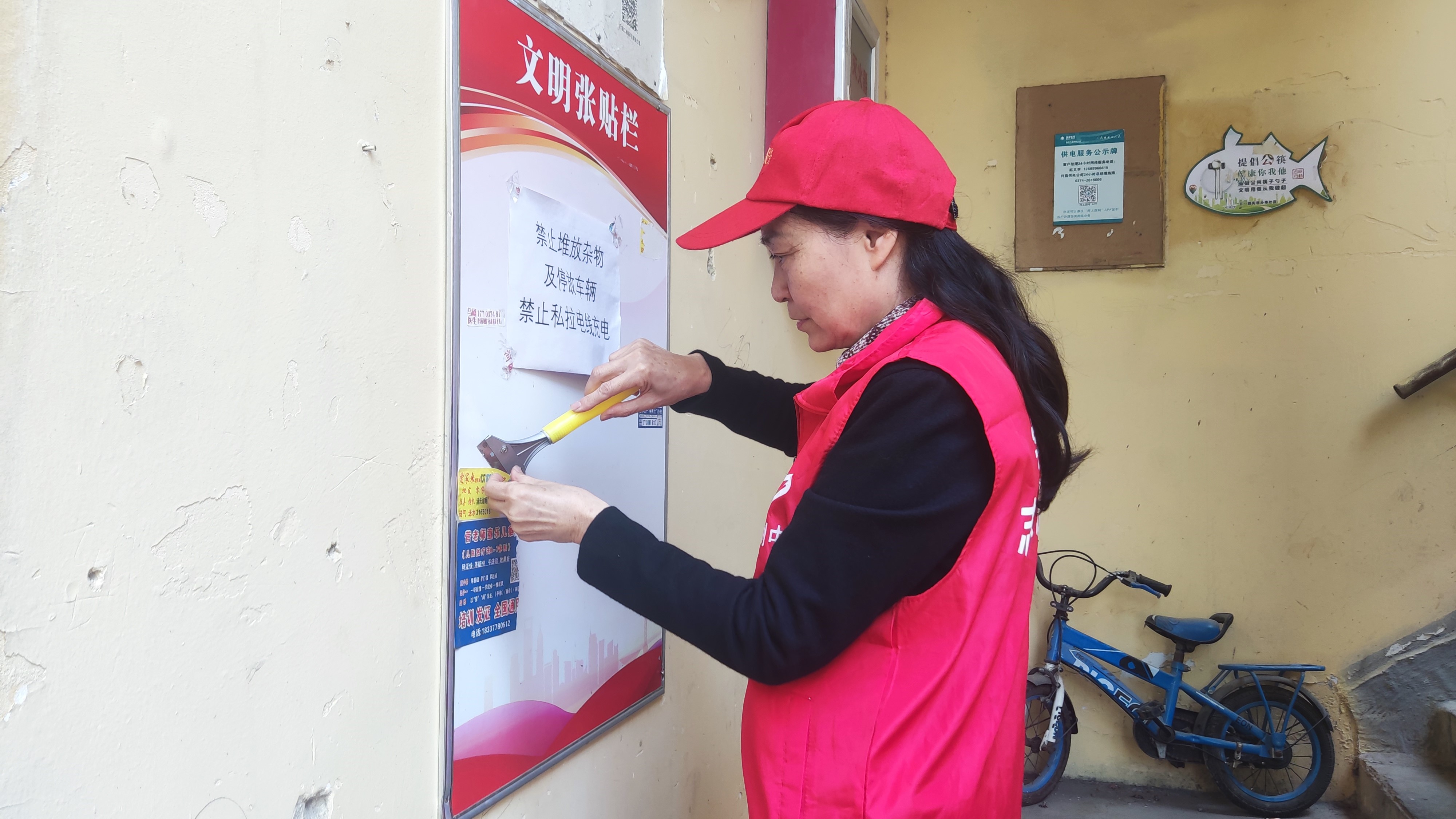 活动现场,志愿者们不怕脏、不怕累,个个热情高涨、奋力争先,通过手持夹子、铲子、扫帚等工具,对小区内地面纸屑、烟头等物杂物进行清理,对墙面小广告进铲除,同时,对小区停放不规范的电动车进行规范摆放。经过大家持续努力,小区的环境更加干净整洁有序。