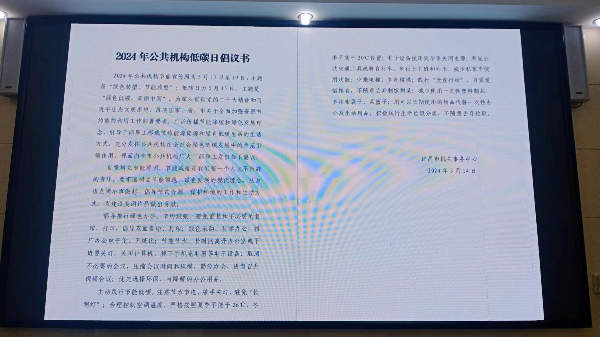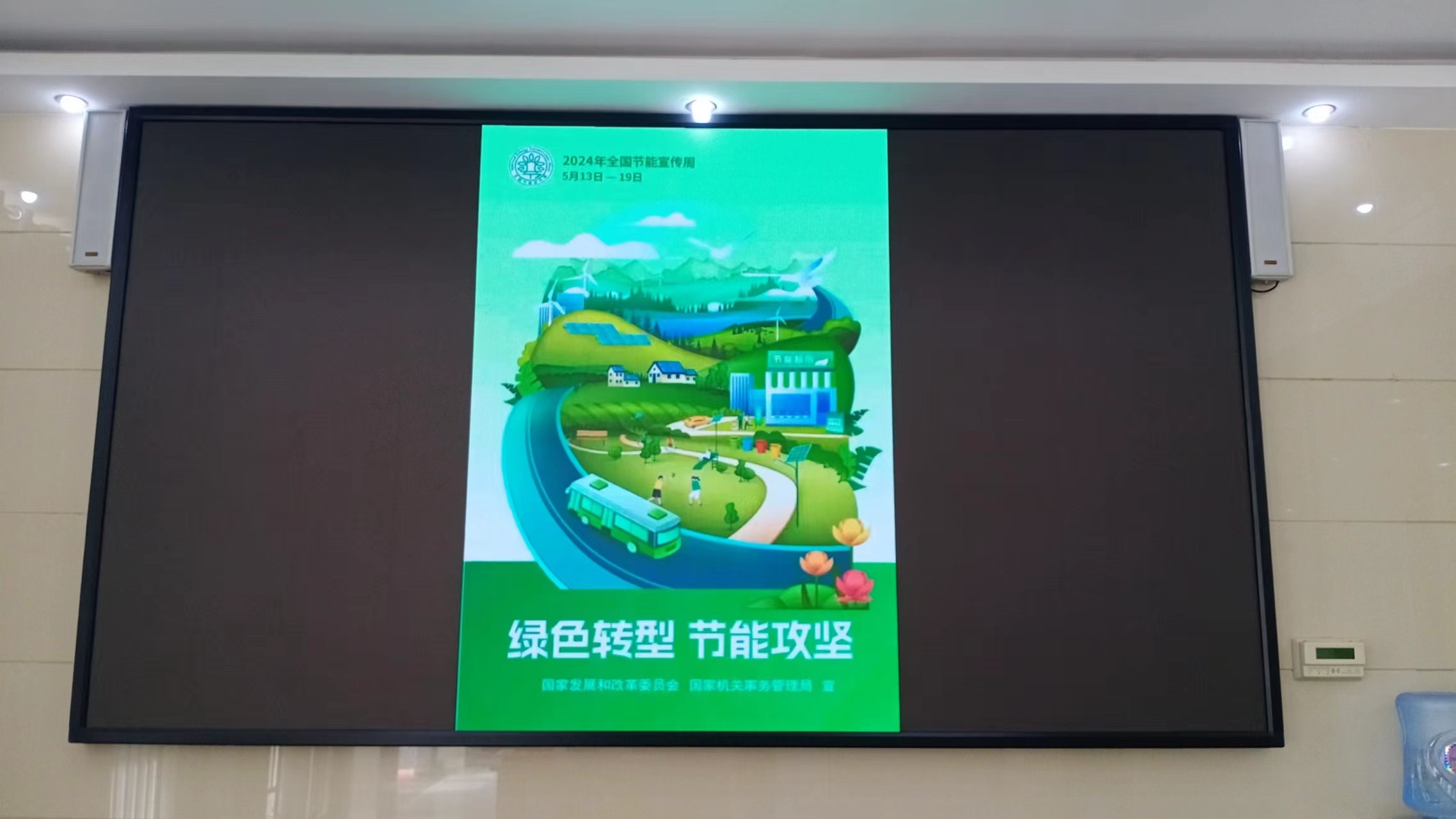 播放公益宣传海报。通过电子大屏幕,循环播放国家发改委和国家机关事务管理局印制的节能宣传海报,播放许昌市机关事务中心向全市公共机构发出的《2024年公共机构低碳日倡议书》。与此同时,通过展板等宣传阵地对节能降碳主题进行多方位宣传。