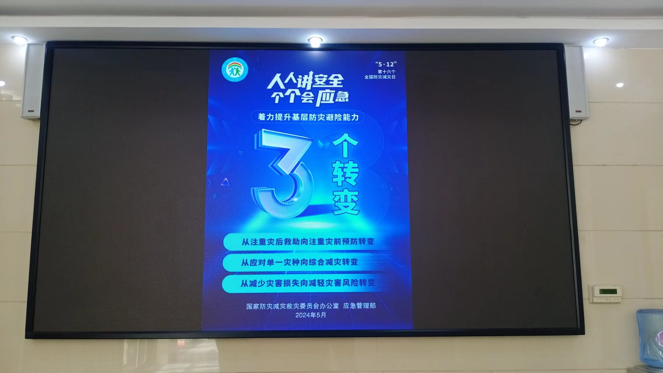 宣传周期间,通过大厅电子屏幕不间断滚动播放防灾减灾海报,让“2个坚持”“3个转变”意识更加深入人心,从而引导广大干部职工从源头上防范和化解安全风险,不断提升防灾减灾意识,切实筑牢防灾减灾安全防线。下一步,中心将组织参与现场防灾减灾培训,进一步提升广大干部职工自救互救能力。