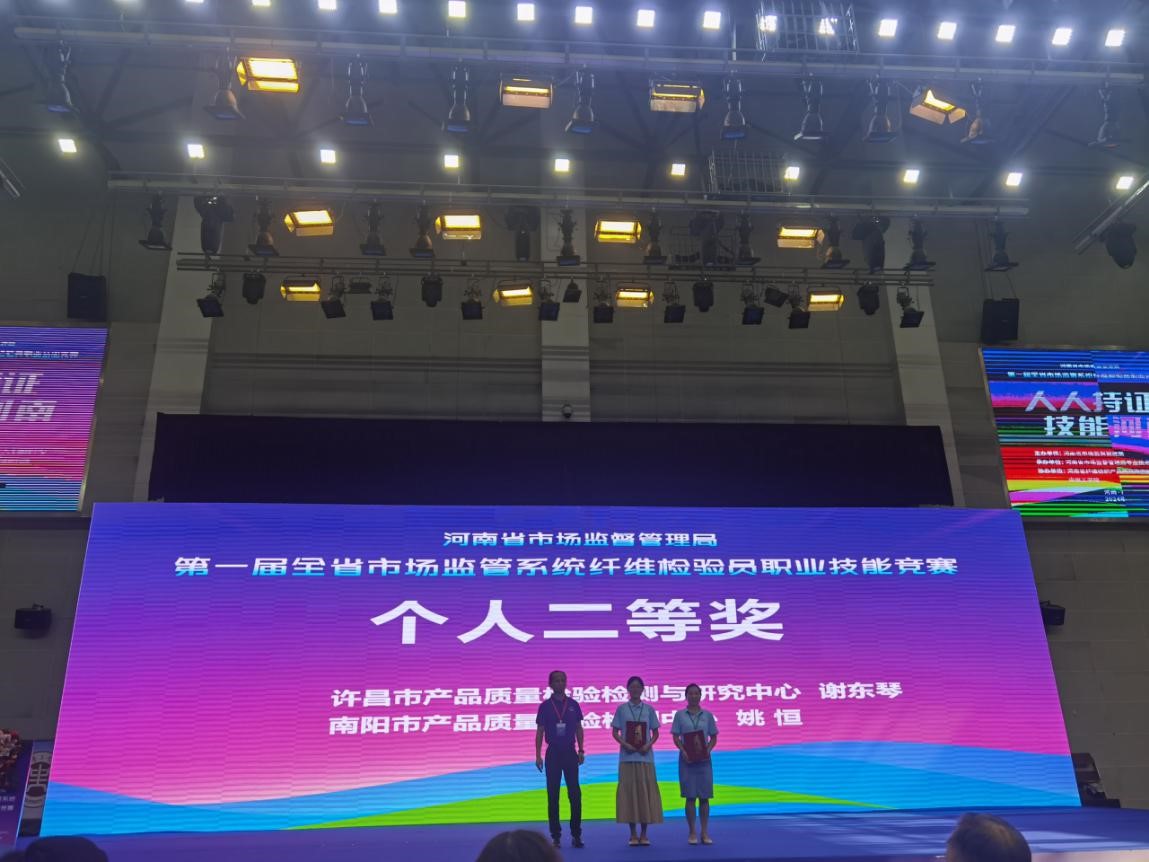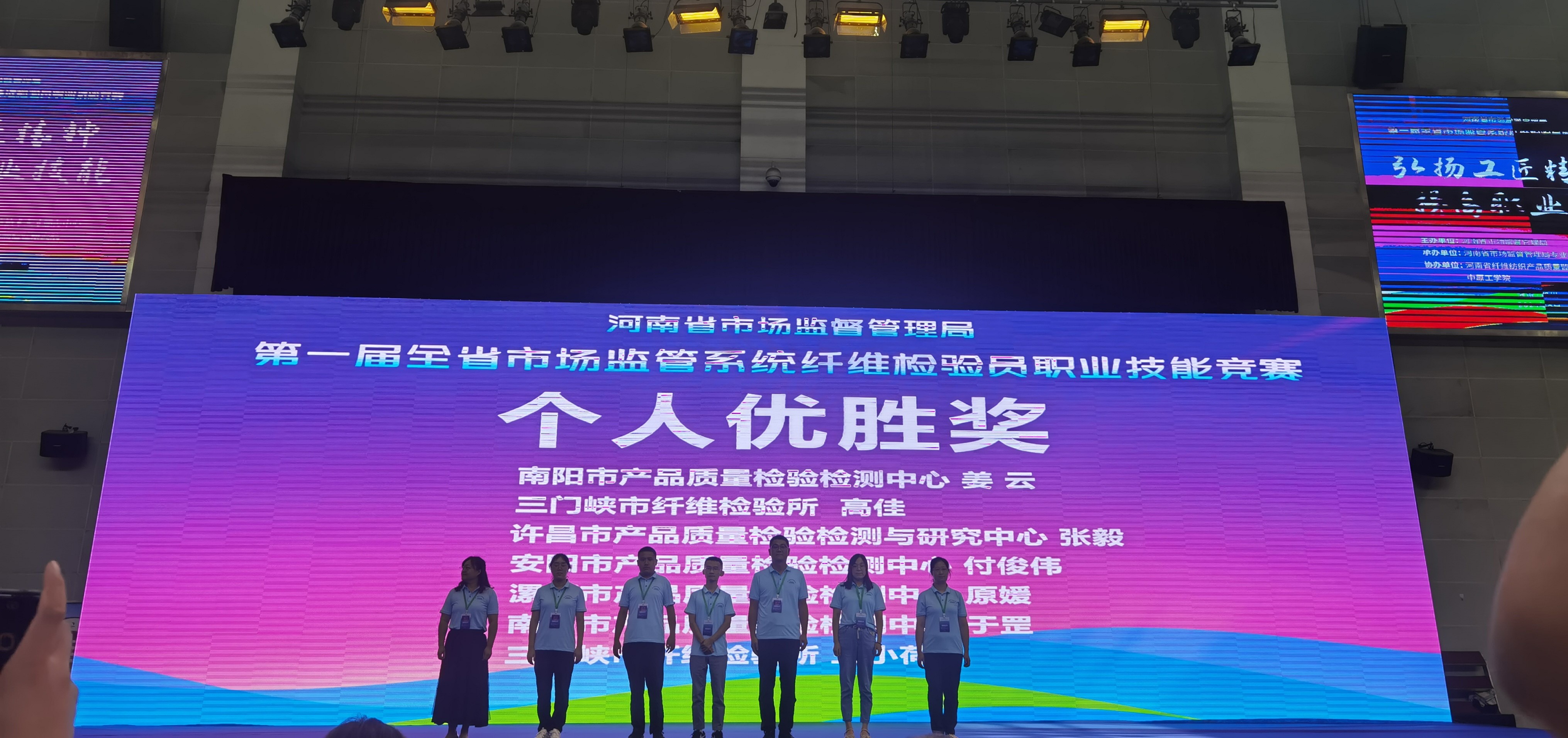 8月27日,由河南省市场监督管理局举办的第一届全省市场监管系统纤维检验员职业技能竞赛顺利举行,共有来自全省各地市16支参赛队伍、96名参赛队员参赛。经过激烈角逐,我市代表队取得团体竞赛一等奖,谢东琴荣获个人二等奖,张毅荣获“个人优胜奖”。团体参赛人员为:周丽娟、  马瑞丽、张斌、张毅、刘骞、谢东琴。对所有参赛同志优异成绩的取得表示热烈祝贺!中心号召全体干部职工以他们为榜样,立足岗位,刻苦钻研,对标先进、追赶先进、成为先进,为中心检验检测事业发展增光添彩!